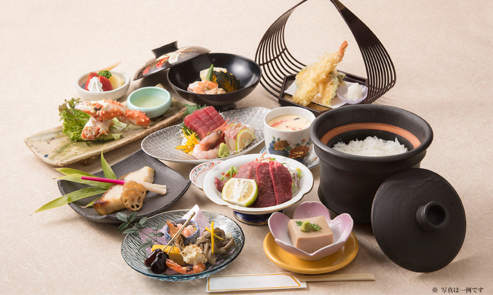 | 食前酒、お造り、焼き物、煮物、口替わり、揚げ物、茶碗蒸し、フルーツ、汁物、ご飯 | |